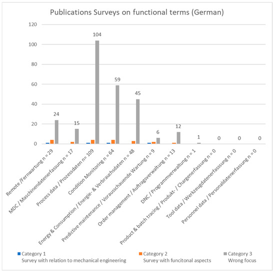 In addition, a keyword search was carried out via “Google Scholar” for the number of publications on the relevant functionalities in both German and English. Depending on the result, a specific term was searched for, and if the number of hits was low, the procedure was repeated with a simplification (secondary term). With this procedure, it occurred that publications that come from a subject area other than the one referred to were also counted, especially when searching with secondary terms in the English language. Therefore, a search was carried out using the IEEE Xplore system in the digital library, an English-language library for the subject areas of computer science, electrical engineering, and electronics and related areas (Appendix B, Table A2).