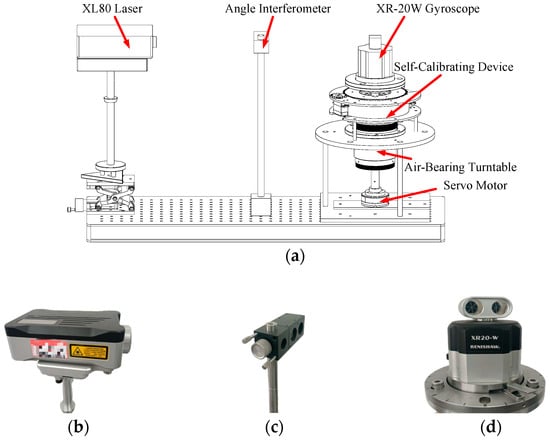 Experimental platform. (a) Schematic diagram of the experimental platform; (b) XL80 laser module; (c) angle interferometer; (d) XR-20W gyroscope.