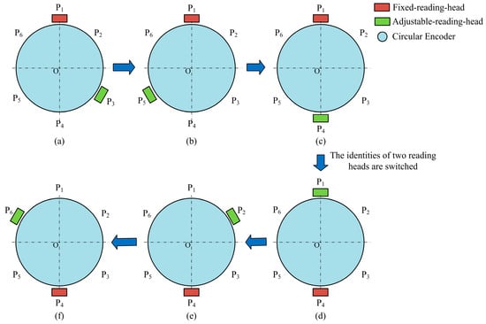 Process of adjusting positions of two reading heads. (a) Fixed reading head is at P1 and adjustable reading head is at P3; (b) Fixed reading head is at P1 and adjustable reading head is at P5; (c) Fixed reading head is at P1 and adjustable reading head is at P4; (d) The identities of two reading heads are switched; fixed reading head is at P4, and adjustable reading head is at P1; (e) Fixed reading head is at P4, and adjustable reading head is at P2; (f) Fixed reading head is at P4, and adjustable reading head is at P6.