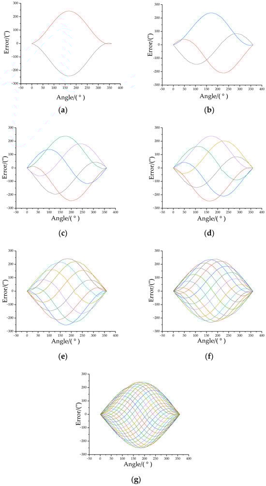 Measured error curve of each position when two reading heads simulate multiple reading heads (different equal divisions). (a) Two equal divisions; (b) three equal divisions; (c) five equal divisions; (d) six equal divisions; (e) ten equal divisions; (f) fifteen equal divisions; (g) thirty equal divisions.