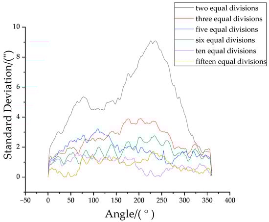 The difference in data for each group can be used as an indicator to evaluate the stability of the self-calibration results of the TRAP method in this paper. The variability of each group of data can be quantified by calculating the standard deviation of the data in this group. Figure 8 shows the standard deviation for each group with different equal divisions. The legend in Figure 8 represents the number of equal divisions. As can be seen in Figure 8, the variability of the measured data is gradually reducing as the number of reading heads simulated by the two reading heads increases. The difference between the groups of data is greatest in the two equal divisions. In this case, the standard deviation is calculated as follows: