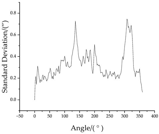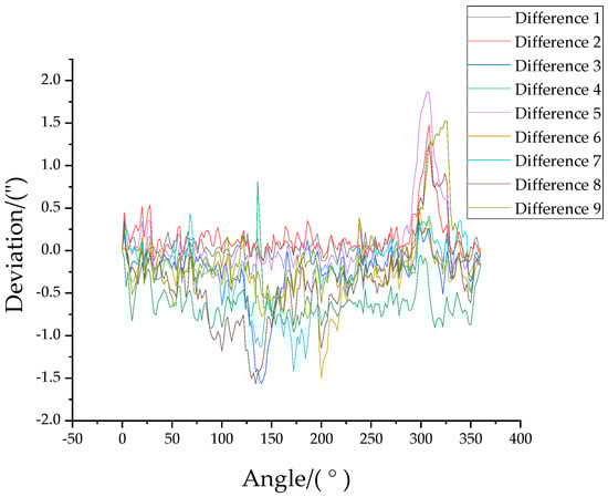 In order to verify the repeatability of the experimental system, 10 sets of two reading heads simulating three reading heads (three equal divisions) were carried out under the premise of ensuring the same installation position of the virtual reading head. Figure 9 shows the difference between the data from the group-1 trial and the data from the other nine groups. As can be seen in Figure 9, the repeatability of the data for each group of measurements is good. Further, the standard deviation of these data in Figure 9 is also calculated, and the results are shown in Figure 10, where Max () = 0.75″ for all measured positions.