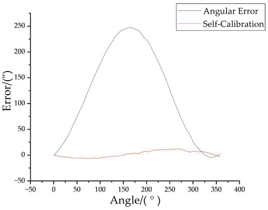 As shown in Figure 11, it is a comparison graph of the measurement errors before and after the error compensation under the current experimental conditions. Before error compensation, the error peaks are 247.72″ and −4.69″, respectively, and the error of angle measurement is 252.41″; after error compensation, the error peaks are reduced to 12.10″ and −6.72″, respectively, and the error of angle measurement is 18.82″. Through THE contrast experiment, it can be clearly seen that the use of the present self-calibration method has an obvious suppression effect on the error of angle measurement.