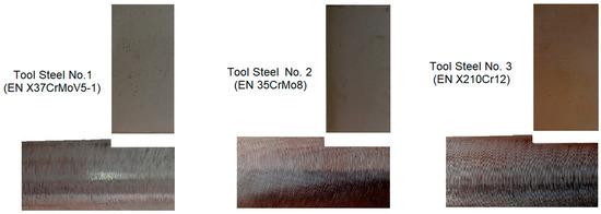 During the experimental research, three tool steels were used to make the samples: a low-alloy tool steel with the designation EN X37CrMoV5-1 (W.-Nr. 1.2343); a medium-alloy tool steel with the designation EN 35CrMo8 (W.-Nr. 1.2311); and a high-alloy tool steel with the designation EN X210Cr12 (W.-Nr. 1.2080). EN X37CrMoV5-1 is a chromium–molybdenum–silicon–vanadium tool steel, which is suitable for hardening in oil and air, with very good hardenability, high heat strength, and tempering resistance. It has good toughness and plastic properties at normal and elevated temperatures, with resistance to cracking. It is suitable for heat treatment to a strength of Rm ≥ 1800 N·mm−2. It is well machinable and hot-formable. It is used for the production of die-casting molds for aluminum, zinc, and magnesium alloys and their fixed and movable parts, hot forming tools (die and die liners), and water-cooled tools such as dies, mandrels, jaws, punches, shears etc. EN 35CrMo8 is a chromium–molybdenum tool steel characterized by very good hardenability and good heat strength. It is suitable for nitriding, cementing, and hardening, with a strength of Rm ≥ 2000 N·mm−2. It has good machinability in an annealed state; therefore, it is used for parts of molds and tools for hot forming and for thermally stressed tools. It is also suitable for large injection molds for plastic materials and die-casting molds. EN X210Cr12 is a chrome ledeburite tool steel with a content of alloying elements of 1.80–2.05% C and 11.0–12.5% Cr and is characterized by high resistance to wear by abrasion, while it can withstand dimensional changes even in elevated temperatures. It is suitable for hardening in oil and air to a strength of Rm ≥ 2300 N·mm−2. It has good cutting properties, very high compressive strength, and very low toughness. These properties make it optimal for the production of highly stressed and complex-shaped cold shearing tools. It is also suitable for simple and symmetrical tools for pressing and tools for hot rolling. It is also used for the production of small molds with a long service life for forming plastic and powder materials, glass, porcelain, ceramic materials, etc. The basic mechanical and physical properties of tool steels EN X37CrMoV5-1, EN 35CrMo8, and EN X210Cr12, including their chemical compositions, are shown in Table 1 and Table 2.