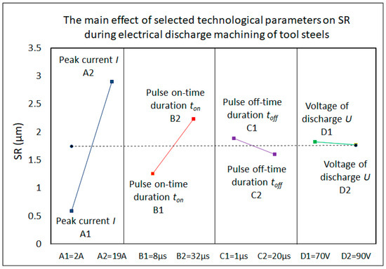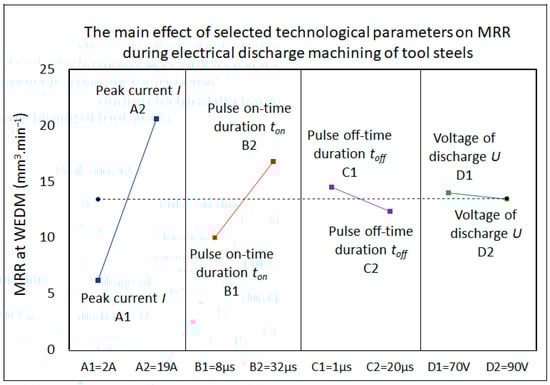 From the analysis results of the main effects of the chosen input factors on the quality of the SR of the machined surface (Figure 4) and the performance of the electrical discharge process MRR (Figure 5) during WEDM of tool steels, it is apparent that the peak current I has the greatest influence on both monitored output parameters. The voltage of discharge U and the pulse off-time duration toff have the least influence on both considered output process parameters.