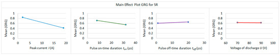 The optimal parametric combination of the input-independent MTPs of the electrical discharge process was selected based on the highest mean values of GRG from Table 8. A higher GRG value indicates a stronger correlation with the reference sequence and better performance, that is, higher mean GRG values indicate minimum SR values and maximum MRR values. The GRG weight for SR is 0.50895, and the GRG weight for MRR is 0.49105, which indicates the higher importance of the output quality parameter of the machined surface during WEDM of tool steels with a wire electrode. The optimal setting for input technological parameters of multiple responses of SR during WEDM of tool steels is I1-ton1-toff2-U1, which corresponds to a combination of parameter settings of I = 1 A, ton = 8 μs, toff = 20 μs, and U = 70 V. The differences in the max and min values of the mean GRG for SR ranked in sequential order from highest to lowest (0.42203, 0.17028, 0.05011, and 0.01069) correspond to the order of the main input technological parameters of the electrical discharge process I, ton, toff, and U. A higher value represents a higher weight of the parameter. From this, it is evident that I has the greatest influence on the multiple responses during WEDM of tool steels. Figure 6 shows plots of the main effects of GRG on SR during WEDM of tool steels.