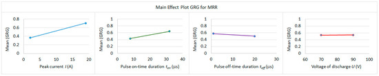 It is true that the higher the considered GRG value, the stronger the relational degree between the ideal sequence and the given sequence . Therefore, the ideal sequence is the best response to the process in the experimental setup. It follows that the highest GRG corresponds to the combination of process input parameters that are closest to their optimal setting. In our case, this corresponds to the combination of the input MTPs of the electrical discharge process, which was applied in experiments L3 and L14. At the same time, the combination of the settings of the input-independent MTPs during WEDM of tool steels with the primary emphasis on minimizing the parameter SR corresponded to the setting at the L3 level, and with the primary emphasis on maximizing the parameter MRR, the setting of the input parameters corresponded to the L14 level. In order, the next suitable levels with optimal MTP settings were L13, L4, and L1. Table 8 shows the main effects on the mean value of GRG for the output quality parameter SR of the machined surface and the output performance parameter MRR during WEDM of tool steels.