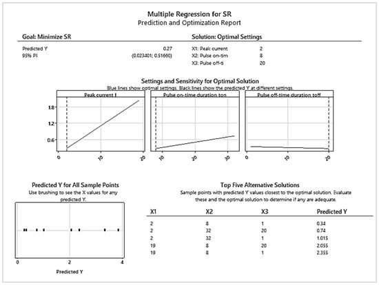 Based on the results of Multiple Regression for SR presented in Figure 8, it is possible to observe the prediction of the influence of the individual input factors I, ton, and toff on the output qualitative parameter SR of the machined surface during WEDM of tool steels with regard to its minimization. At the same time, the predicted combination of five settings of the given input factors with regard to the minimization of the achieved parameter SR in the range of 0.34 to 2.355 μm is presented.