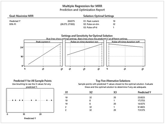 Figure 9 shows the prediction and optimization report for Multiple Regression of the output quantitative performance parameter MRR during WEDM of tool steels.