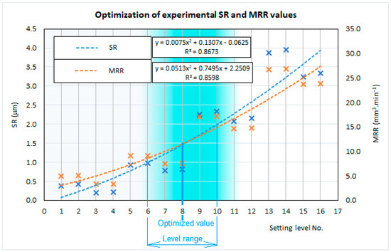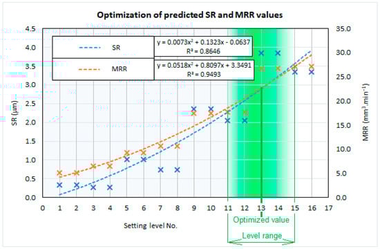 On the basis of the obtained data, a mutual optimization of the output qualitative indicator of the machined surface SR was subsequently carried out with regard to the maximization of the productivity of the electrical discharge process MRR during WEDM of tool steels. Figure 10 shows the graphic optimization of the output parameter SR with regard to the maximization of the MRR parameter, performed on the basis of their predicted values, which were obtained through the MRM defined by Formulas (8) and (9).