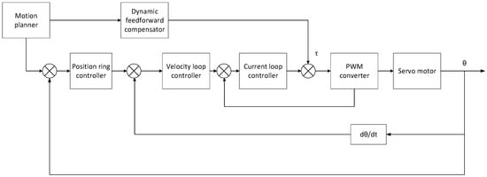 Figure 2 shows the vibration control system structure of the industrial robot discussed in this paper. The closed-loop control system also employs filtering optimization of the motion trajectory and feedforward compensation to effectively suppress vibrations. This paper combines closed-loop control with dynamic feedforward compensation to suppress robot vibrations. The use of dynamic feedforward significantly improves the robot’s motion performance. The proposed method addresses these issues and improves the robot’s overall performance. In industrial settings, robots may experience motion errors and vibrations due to inertia, friction, and other dynamic effects when performing high-speed motion, complex path tracking, or precision manipulation. Introducing closed-loop control-based dynamic feedforward can improve the robot’s accuracy in performing tasks. This compensation method improves the smoothness, trajectory consistency, straightness, and trajectory tracking of the robot’s motion, as well as the anti-disturbance ability and robustness of the control system. The method for suppressing vibrations prepares the manipulator for trajectory tracking capability and operational efficiency.