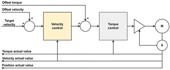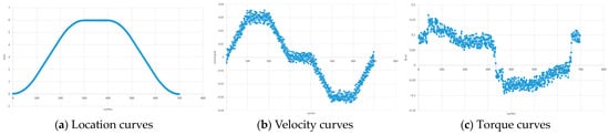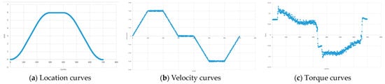 Figure 8, from which it can be seen that the robot’s velocity and torque have large amplitudes that affect the control. The robot is controlled in synchronized position mode, and although it also has a certain amplitude on the position curve, it is not significant enough relative to its position scale.