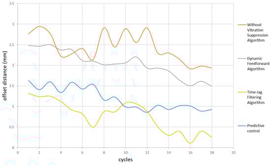 To evaluate the actual vibration effect of the relevant vibration suppression algorithms (predictive control algorithm, time-lag filtering algorithm, and dynamic feedforward algorithm) on the robots, a comparative test was carried out. Four sets of offset distance values were collected for Formula (18).