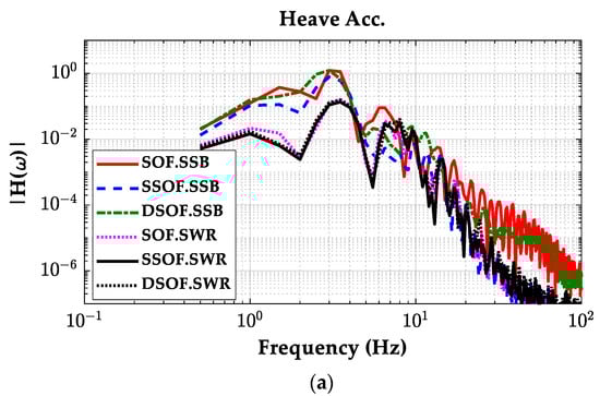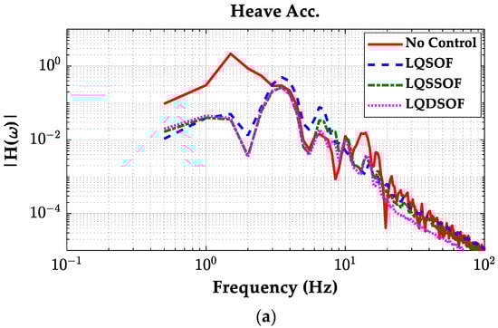 Frequency responses of LQSOF, LQSSOF, and LQDSOF on the single sine bump. (a) Heave accelerations; (b) pitch rates.
