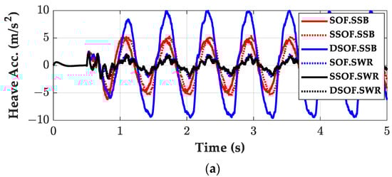 As shown in Figure 7 and Figure 8, the three controllers show good performance in terms of the heave acceleration of the sprung mass. This is achieved by setting the weight ρ1 very high. A notable feature is that these controllers show identical performance to one another in view of the heave acceleration and pitch rate of the sprung mass on SSB and SWR. Another feature is that these controllers have relatively poor performance in controlling the pitch rate. If one wants to reduce the pitch rate, then the weight ρ4 should be set higher. However, as a result, the heave acceleration will increase. This is a well-known tradeoff among the terms in the LQ objective function. As shown in Figure 7c, the control inputs converge slowly to zero because the controllers are just derivative and do not use displacement signals. To remove this phenomenon, an integral control can be included in those controllers.