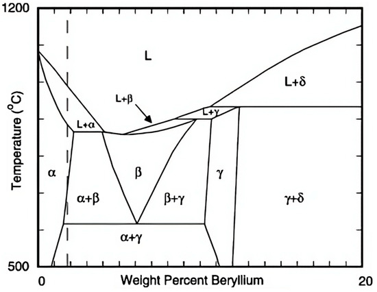 Moreover, electropolishing offers a more straightforward process that can effectively be applied to larger surface areas [15,16]. On the contrary, Be [17] is acknowledged for its inherent hardness and granular state, requiring powder metallurgy technology. Additionally, Be and its compounds are toxic, which can incur high costs and complexity in manufacturing and repair/service [18,19,20,21]. This inherent characteristic poses challenges in attaining polished and flawless surfaces due to the abrasive nature of the hard particles, thereby exacerbating tool wear during the machining of an injection moulding insert of a Cu-Be [22] alloy by amplifying the costs and intricacy associated with manufacturing and repair/service procedures [19]. Figure 1 depicts a binary phase diagram of CuBe alloys.