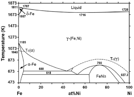 Fe-Ni phase diagram where stable phase equilibria are demonstrated (adapted from [40]).