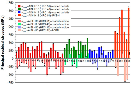 Surface residual stresses were investigated during the turning process of H13 (DIN 1.2344) tool steel, employing coated cemented carbide and PcBN cutting tools across 56 distinct cutting conditions [69].