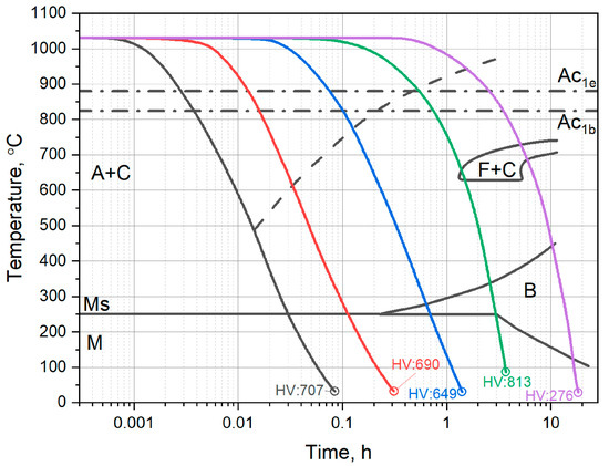 Typical Time–Temperature-Transformation (TTT) diagrams (alongside Continuous Cooling Transformation (CCT) diagrams) delineate the onset of phase precipitation in AISI H11 (DIN 1.2343) hot work tool steel. The symbols represent austenite (A), cementite (C), martensite (M), bainite (B), martensite start temperature (MS), ferrite (F), and the initiation (Ac1e) and conclusion (Ac1b) temperatures of austenite transformation [78].