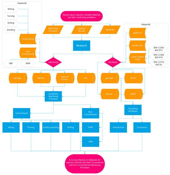 The research and information-compiling phases were carried out through SLR since it is based on a systematic, method-driven, and replicable approach [89,90]. The platform used for SLR was Dimensions.ai, which is connected to all data from Scopus. The method employed for research and data compilation was assessed for quality by considering factors such as citation score and journal impact, and it was systematized. The information sources utilized for this review included ScienceDirect, Springer, MDPI, and ResearchGate platforms, all renowned for their reliability and expertise. To collect data on these subjects, relevant keywords and their combinations were employed, for example, manufacturing processes, machining, conventional, non-conventional, injection moulds, INVAR-36®, Fe-Ni36, CuBe, and HT steels. While collecting articles, all critical information was systematized in a table, including processes, names, sources, respective journals, and an indication that it had been used.