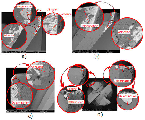 SEM images of a TiAlTaN-coated tool during testing at Lcut = 53.6 m and f = 750 mm/min. Magnifications of 100× and 220× of the following: (a) Tooth 1 of the cutting tool with CF, (b) Tooth 2 of the cutting tool with CF, (c) Tooth 2 of the cutting tool with RF, and (d) the top surface [34].