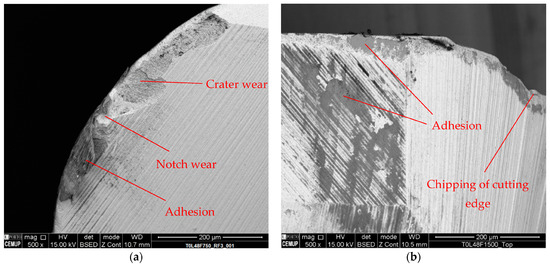 (a) Wear mechanisms observed on the RF of an uncoated tool during testing at Lcut = 48 m and f = 750 mm/min. (b) Wear mechanisms detected on the top surface (TOP) of tools employed by an uncoated tool during testing at Lcut = 48 m and f = 1500 mm/min [14].