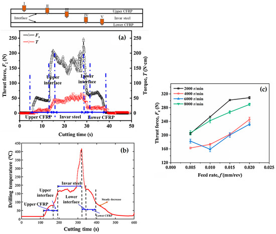 The progression of the (a) thrust force and (b) Tcut signals as the tool advances during single-pass drilling; (c) the evolution of thrust forces with various processing parameters in the INVAR-36® layer [133].