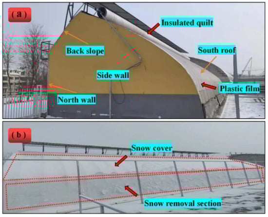 Chinese solar greenhouses (CSGs) contribute significantly to the supply of fruits and vegetables in northern China. However, heavy snowfall during winter in the middle and high latitudes causes snow accumulation in CSGs [1,2,3]. The snow accumulation on the front roof of CSGs results in low crop yield, mechanical damage, or greenhouse collapse [4,5]. The general construction of a CSG is depicted in Figure 1a, which shows the south roof, back slope, back wall, and side walls [6]. As shown in Figure 1b, the south roof is covered with an insulation quilt to maintain the temperature stability inside the CSG during snowfall. However, the differing inclination degrees of the front roof led to the natural shedding of snow at the bottom’s more significant inclination angle and the creation of snow at the top slight inclination angle.