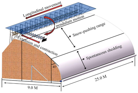 Owing to the environmental variances and varied crops cultivated in each location, the span of the CSG, the inclination angle of the south roof, and other structural parameters are different. Therefore, the shape of the south roof of a solar greenhouse is irregular. Moreover, the south roof is coated with insulation, which makes installing and maintaining a snow removal device (SRD) difficult. Most farmers still use snow shovels or blowers to remove snow, which incurs high labour costs. Greenhouses often collapse owing to untimely snow removal, causing considerable economic losses. Computer-aided engineering technology is used to simulate the deformation of Chinese solar greenhouse skeletons under wind and snow loads [7,8]. The aforementioned studies provide a theoretical basis for the rational optimisation of the skeleton. An electric-motor-driven rail-type snow shovel is used to remove snow from coloured steel tiles [9]. Researchers have improved robots to clear snow from sloping roofs [10]. Yan and Zhou proposed models for snow drifting on flat and sloping roofs, respectively [11,12]. Electricity is used to heat solar panels to remove snow from tilted solar panels [13,14]. Researchers have developed an early warning mechanism for greenhouse snow loads based on a greenhouse snow collapse model [15]. Projects have been created to solve the problem of snow accumulation in solar greenhouses. The structure of the film winder is changed, and mechanical waves are generated for snow removal [16]. However, this method is only applicable to southern plastic greenhouses and not northern solar greenhouses. In one study, roller brushes were connected in series to a hydraulic pivot arm. The hydraulic arm was connected to a tractor, which was manoeuvred to remove snow from a solarium [17]. However, the device was bulky and could not be automated. Thus, none of the aforementioned SRDs can solve the problem of snow accumulation on the south roof of solar greenhouses.