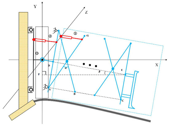 A motion sketch of the SRD was created to illustrate its range of activity, as shown in Figure 4. Here, the black line box represents the track trolley, which can move along the east–west track. The blue line box represents the scissor structure, which can contract or extend. These two structures are connected by a hinge that can be rotated up and down. A Cartesian coordinate system is created using the centre point of the hinge as the origin. South is the positive direction of the z-axis. Vertical upwards is the positive direction of the y-axis. East is the positive direction of the z-axis. Take point E as the research object and analyse its activity range in 3-dimensional space, E (x, y, z). α is the extension angle of the scissor structure controlled by the pusher ①; β is the dip angle of the scissor structure controlled by the pusher ②; and is the length of the hinge l1. is the length of the arm l. N is the number of scissor units. The range of activity of point E in the x-direction is shown in Equation (4). The range of activity in the y-direction is shown in Equation (5). The range of activity in the z-direction is equivalent to the length of track laying, 0 M < z < 25 M.