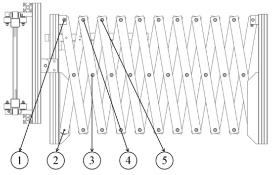 As shown in Figure 5, point 1 is the electric actuator lower swing arm installation position. Four upper swing arm installation positions are present, of which point 2 has stress concentration when the scissor arm tightens. Point 3 is extremely long owing to the upper swing arm, meaning that the scissor arm cannot be drawn. At point 5, the length of the actuator cannot meet the requirements of the maximum extension angle. Thus, point 4 is the optimal installation position.