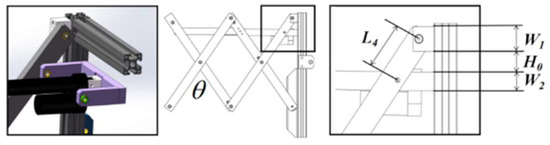 During the extension of the scissor arm, the electric actuator swing arm moves higher, and the force analysis reveals that the ideal installation location is an extension angle of 120°. As illustrated in Figure 6, the lower swing arm rises when the scissor arm is extended. At an angle () of 120°, the distance of is 0. The mathematical relationship is shown in Equation (6), where = = 4 cm, the value of angle is 0°–120°, 0, and the minimum value of the distance, , between the lower swing arm of the linear actuator and the scissor arm connection point is 8 cm.