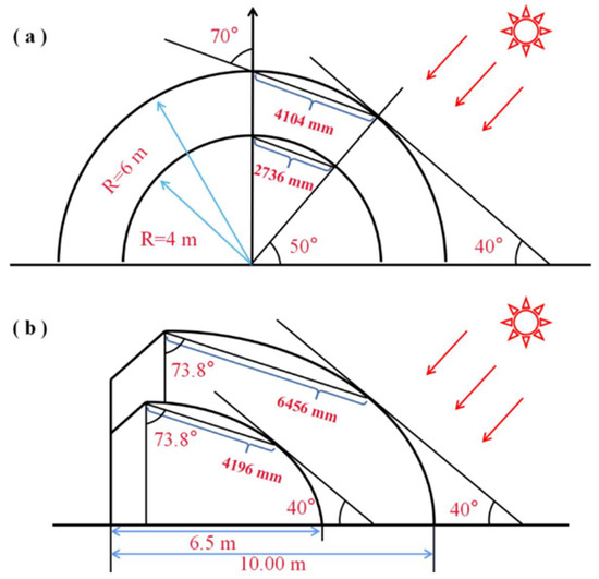 In China, the span of a conventional CSG in the area of 34°–46° N is 6.5–10.0 m, the top height is 3.9–6.6 m, and the inclination angle of the south roof of the greenhouse is 32°–43°. The space inside a round vaulted solar greenhouse (RVSG) is larger, with good lighting and relatively better thermal insulation. Therefore, the span is larger than that of a conventional CSG. Typically, the span of RVSGs is 8.0–12.0 m. Several studies have indicated that when the inclination angle of the south roof of the greenhouse is larger than 30°–40° [29], the snow on the south roof slides down naturally owing to the action of gravity. As shown in Figure 7, the snow accumulation ranges from a roof inclination angle of 40° to the top of the greenhouse is 2736–4104 mm for an RVSG with a span of 8.0–12.0 m. The snow accumulation ranges from a roof inclination angle of 40° to the top of the greenhouse is 4196–6456 mm for a typical CSG with a span of 6.5–10.0 m. The snow accumulation part of both greenhouses can be considered as a sloping surface with an inclination of 70°.