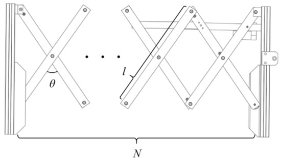 The difference between the conventional CSG and RVSG in snow clearing is evident primarily in the snow range owing to the difference in the cross-sectional structure. The snow removal range of the RVSG is significantly lower than that of the conventional CSG for the same span. The snow removal range, , of the two types of greenhouses is 2.5–6.5 m. The elements connected to the extension of the telescopic mechanism are related to the number of scissor arm sections, , length of the scissor arm, , and extension angle, , as displayed in Figure 8. The correlation is shown in Equation (7).