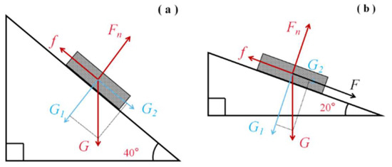 (a) Overall force analysis of snow accumulation at a 40° dip angle. (b) Overall force analysis of snow accumulation at a 20° dip angle.