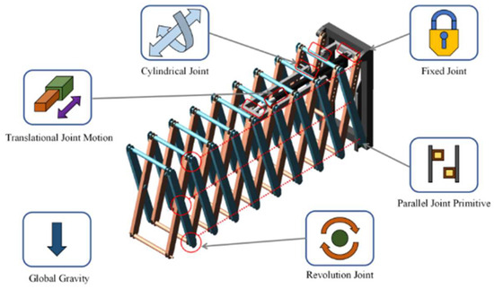 The scissor arm model is drawn using Solid-Works software and saved in a para-solid format. Open Adams-View software is used to import the model. First, the imported model is subjected to Boolean operations to combine the parts. Second, the material properties of each part are renamed and defined. Then, the constraints, contacts, and dynamics are applied. Finally, the solver is set up, and a simulation is performed. The constraints of the structure are set as shown in Figure 10. The driving function employed is the time–displacement function step(time, 0, 0, 10, c) + step(time, 10, 0, 20, −c) + step(time, 20, 0, 30, c) + step(time, 30, 0, 40, −c), where c denotes the displacement. The value of c is calculated using Equation (14), where b is the width of the aluminium profile (b = 38 mm).