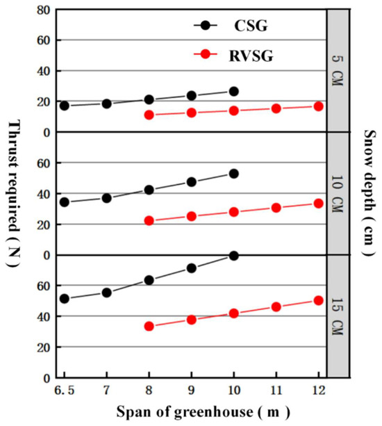 Several studies have indicated that the thicker the snow, the denser it is under gravity. Thus, the value of is considered as the maximum density of snow [30]; = 0.64 g/cm3. The values of , , and are inserted into the Formulas (10)–(13) to obtain the thrust force, . If = 0.75 m, is considered as 5 cm, 10 cm, and 15 cm for each type of greenhouse. The relationship between the range of snow removal and the required thrust force, , for snow removal of different spans is shown in Figure 11. The thrust required for snow removal in both types of greenhouses should be mainly related to the greenhouse span. However, with the increase in span, the thrust required for snow removal in the conventional CSG is higher than that in the RVSG.