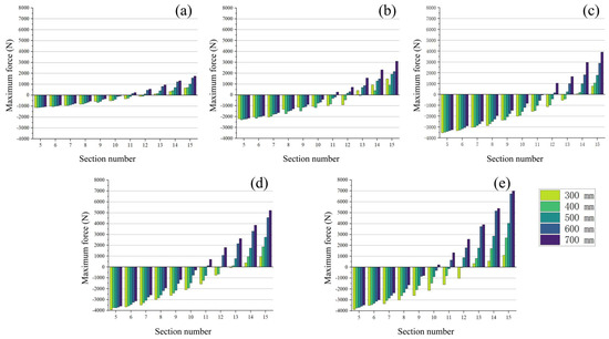 (a–e) Maximum shear force distribution at different scissor arm connection points when the scissor arm thicknesses are 1, 2, 3, 4, and 5 mm, and the extension angle is 120°.