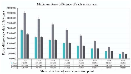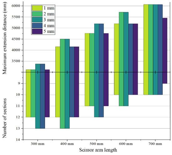 The thicker the scissor arm, the greater the effect of gravity on the mass. The structural strength of the scissor arm connection is less than the structural strength of the shaft when the thickness of the scissor arm is 1–3 mm. Therefore, the shear forces at the connection point should be less than the maximum shear resistance of the scissor arm. For more than 3 mm, the structural strength of the scissor arm will be greater than the structural strength of the shaft. For thicknesses of 1, 2, and 3 mm, the maximum shear resistance is 1260, 2520, and 3780 N. For thicknesses of 4 and 5 mm, the maximum shear resistance of the shaft is subtracted from the maximum shear resistance of 4241 N. The results in Figure 12 show the nodal shear force minus the maximum shear force obtained from the simulation calculations The results indicate that increasing the wall thickness causes a significant increase in the shear force at the connection point of the scissor arm. In contrast, the number of sections that can be applied increases and then decreases as the material thickness increases within the range of the maximum shear resistance. When the wall thickness is small, the maximum shear resistance of the scissor arm is less than the shear force of the shaft and gradually converges to the shear force of the shaft as the wall thickness increases. The number of applied sections also gradually increases, increasing the wall thickness until the maximum shear resistance of the scissor arm and the shaft reaches its optimal length. After the increase in the wall thickness, the structure is significantly affected by gravity, and the shear force at the connection point of the scissor arm increases. In contrast, the structural strength of the shaft remains unchanged, resulting in a decrease in the number of maximum permissible sections.