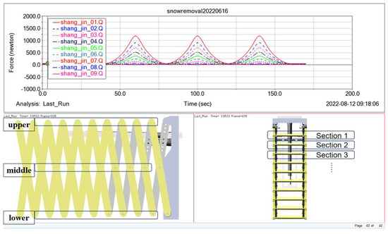 The shear force at the connection point of the horizontally suspended shear structure is influenced by gravity; this is different from the horizontal arrangement with gravity direction and support. The shear force at the connection point exhibits nonlinear changes. In the simulation model shown in Figure 15, a scissor arm with an arm length of 500 mm, a wall thickness of 2 mm, and nine sections is selected as the object of study. The shear force in the upper middle and lower parts of the shear structure is measured during the motion of the shear structure.