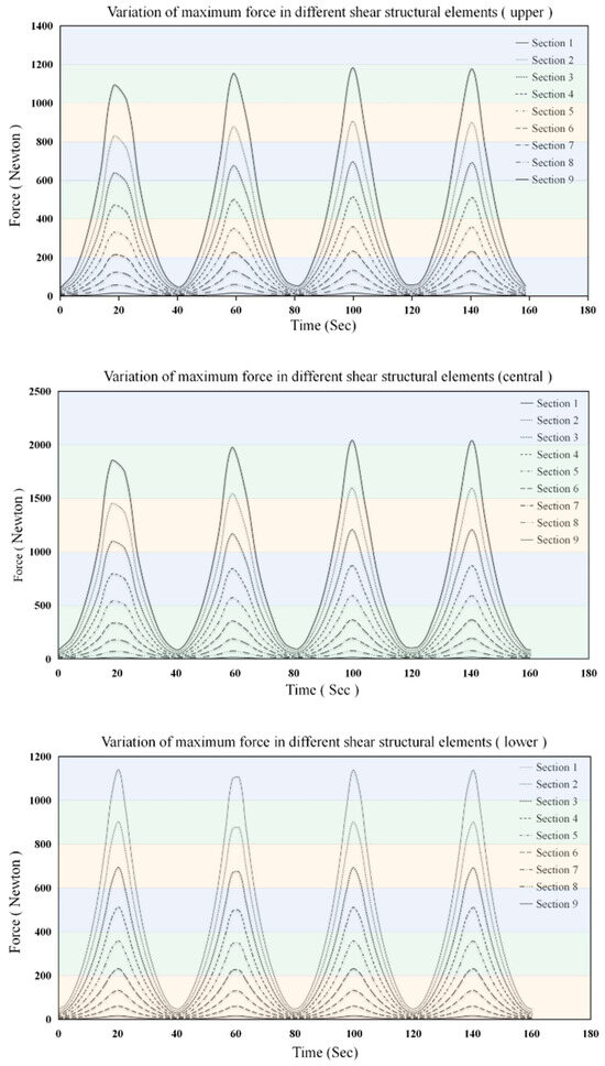 As shown in Figure 16, the shear force at the upper, middle, and lower joints of the shear structure first increases and then decreases during the extension and contraction processes. The shear force in the structure reaches its maximum value at the maximum extension angle. The maximum shear force in the upper, middle, and lower parts of each shear structure unit vary between 41.76–1183.76 N, 84.09–2041.88 N, and 47.54–1141.37 N, respectively.