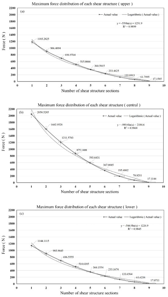 To determine the relationship between the number of scissor arm sections and the maximum shear force, scissor arm shear force is examined by performing functional fitting. As shown in Figure 18, the highest degree of fit is logarithmic, and the results of the logarithmic function fit reveal that the function between the upper connection point of the scissor arm and the maximum shear force is y = −559ln(x) + 1251.9, with a variance of R2 = 0.9899. The functional relationship between the connection point in the middle of the scissor arm and the maximum shear force is y = −989.6ln(x) + 2184.6, with a variance of R2 = 0.9868. The functional relationship between the lower connection point of the scissor arm and the maximum shear force is y = −544.9ln(x) + 1226.9, with a variance of R2 = 0.9845. Therefore, the number of scissor arm sections and their maximum shear force conform to a logarithmic relationship for a shear structure with a horizontal overhanging arrangement.