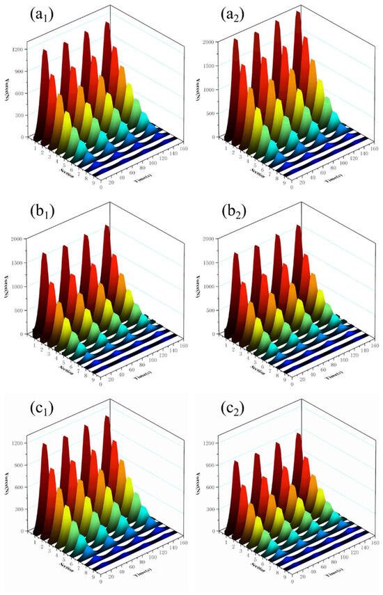 Comparison chart of wall thickness optimisation results of the shear structure. (a1) Shear force at the upper connection point before optimisation. (a2) Shear force at the upper connection point after optimisation. (b1) Shear force at the middle connection point before optimisation. (b2) Optimised shear force at the central connection point. (c1) Optimisation of shear force at the lower front joint. (c2) Shear force at the lower connection point after optimisation.