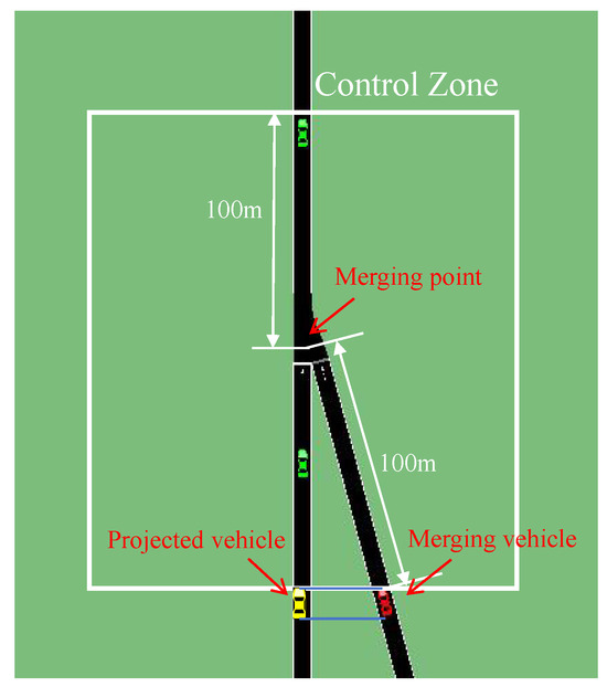 We establish the merging environment inspired by Lin et al. [6]. A control zone for the merging vehicle is established, spanning 100 m to the rear of the on-ramp’s merging point and 100 m to the front of the merging point, as depicted in Figure 1. The red vehicle, operating under reinforcement learning control, is tasked with executing smooth and safe merging within the designated control area.