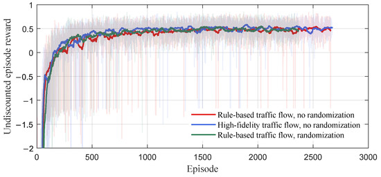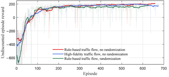 In the freeway environment, we trained 400,000 timesteps in each of three different microscopic traffic flows. It required 1.5 h to complete the training using both rule-based traffic flows without randomization and with domain randomization. In contrast, the training under the condition of high-fidelity traffic flow took 5 h. Vehicle generation probability is 0.14 vehicles per second, and the traffic density on the main road was approximately 11 vehicles per kilometer on each straightaway.