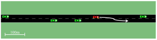 We used a straight two-lane freeway measuring 1000 m in length, inspired by Lin et al. [27]. Figure 3 depicts a standard lane-changing scenario in SUMO, where the ego vehicle is indicated by the red car and the surrounding vehicles are represented by the green cars.