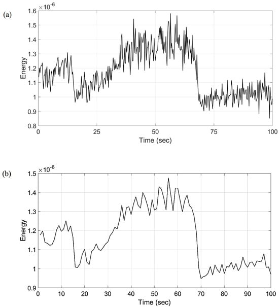 In the applied technique, the length of the window is a very important parameter, and its value directly affects the result of the study. Figure 8 shows a fragment of the wavelet coefficient energy curve for various window lengths. With a small (0.25 s) window length , it will contain a relatively small number of wavelet coefficients inside of the window. As seen in Figure 8a, several peaks and troughs are present over a 100 s time period. It is difficult to isolate the peak or trough corresponding to the actual start time of echo signals. If we take a time window of a relatively large (2 s) length , as shown in Figure 8c, then the energy curve of the wavelet coefficients will be significantly degenerate and the determination of characteristic points in the change in the behavior of the signal under study will cause certain difficulties. Therefore, it is clear that the 1 s window shown in Figure 8b would be the optimal choice for this particular application.