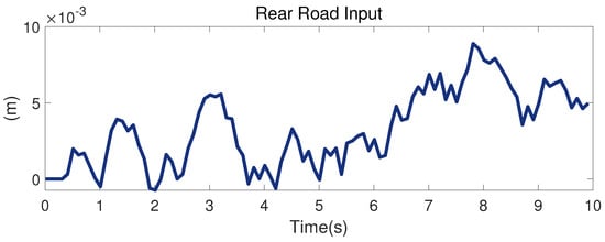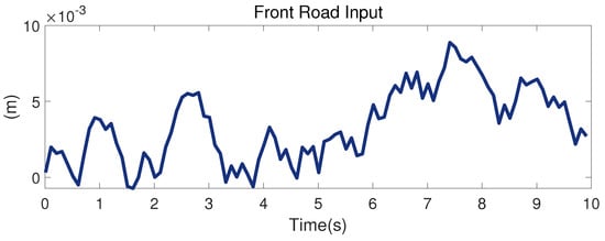When referring to the study of suspension control, the road input should be considered first. When traveling through rough terrain, a car will generate vibration. Studies have commonly adopted two input forms: the random and impact versions. In this study, the most prevalent random road profile is applied. ISO/TC108/SC2N67 [] recommends using the power spectral density function to simulate pavement unevenness. In this study, a random road input model is represented by the integration of white noise signals. The random road input model is expressed as follows: