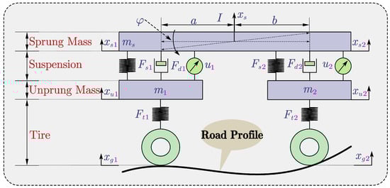 To study the vertical vibration, pitching motion, and coupled vertical and pitching motion of a car, a half-vehicle model is usually utilized, and left–right symmetry is usually assumed to simplify the analysis. Therefore, in this study, a half-car suspension model is used. The half-car model has simplicity and the capacity to precisely describe the essential components. The nonlinear half-car model is shown in Figure 3.