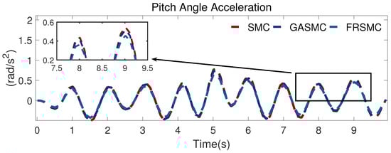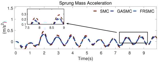 Figure 7 displays the pitch angle acceleration obtained when using the SMC, GASMC, and proposed control strategies. We can see in Figure 7 that the pitch angle acceleration can be suppressed to a smaller amplitude with the proposed FRSMC method than it can with the other two control methods; thus, it is implied that the performance of the proposed controller in terms of ride comfort is more superior to that of the SMC and GASMC methods for suspension control.